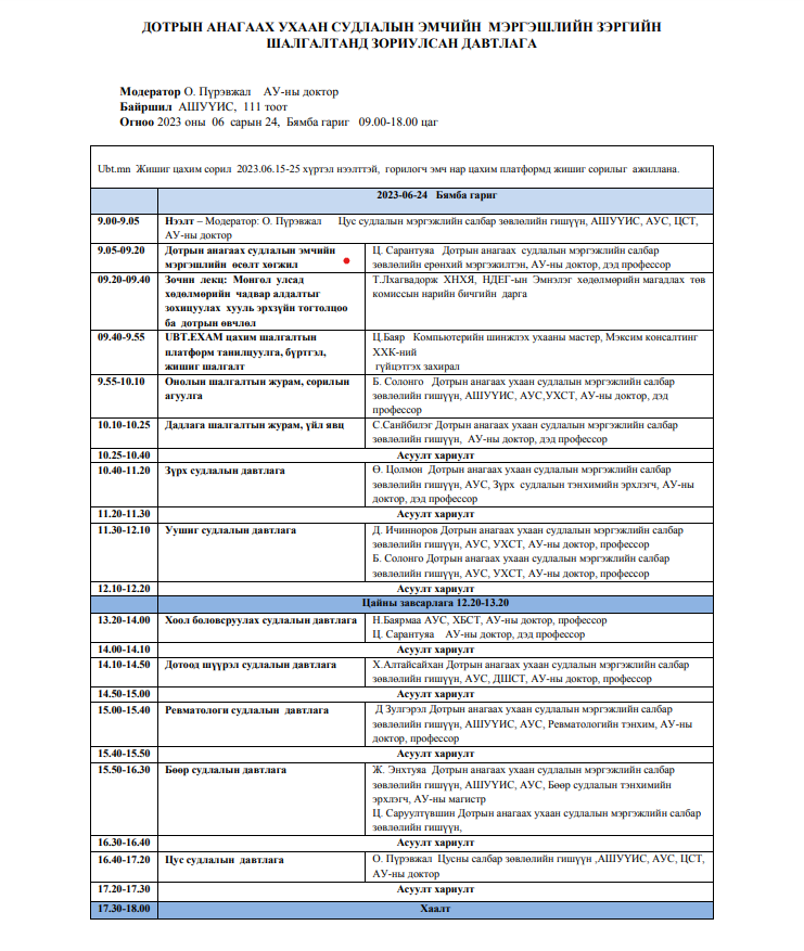 ДОТРЫН АНАГААХ УХААН СУДЛАЛЫН ЭМЧИЙН МЭРГЭШЛИЙН ЗЭРГИЙН ШАЛГАЛТАНД ЗОРИУЛСАН ДАВТЛАГА